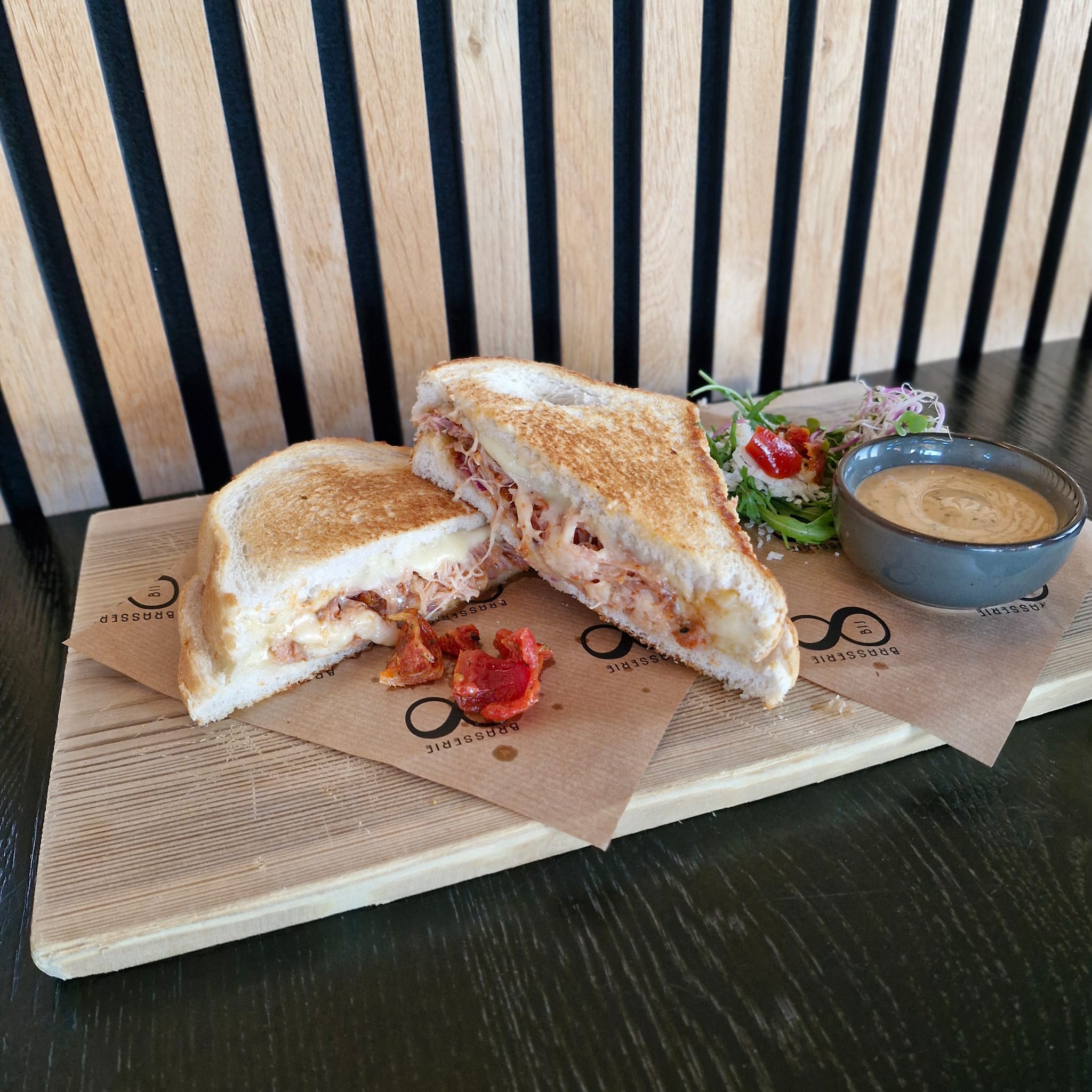 Tosti pulled chicken met rode ui, sweet chili saus, zon tomaatjes en kaas